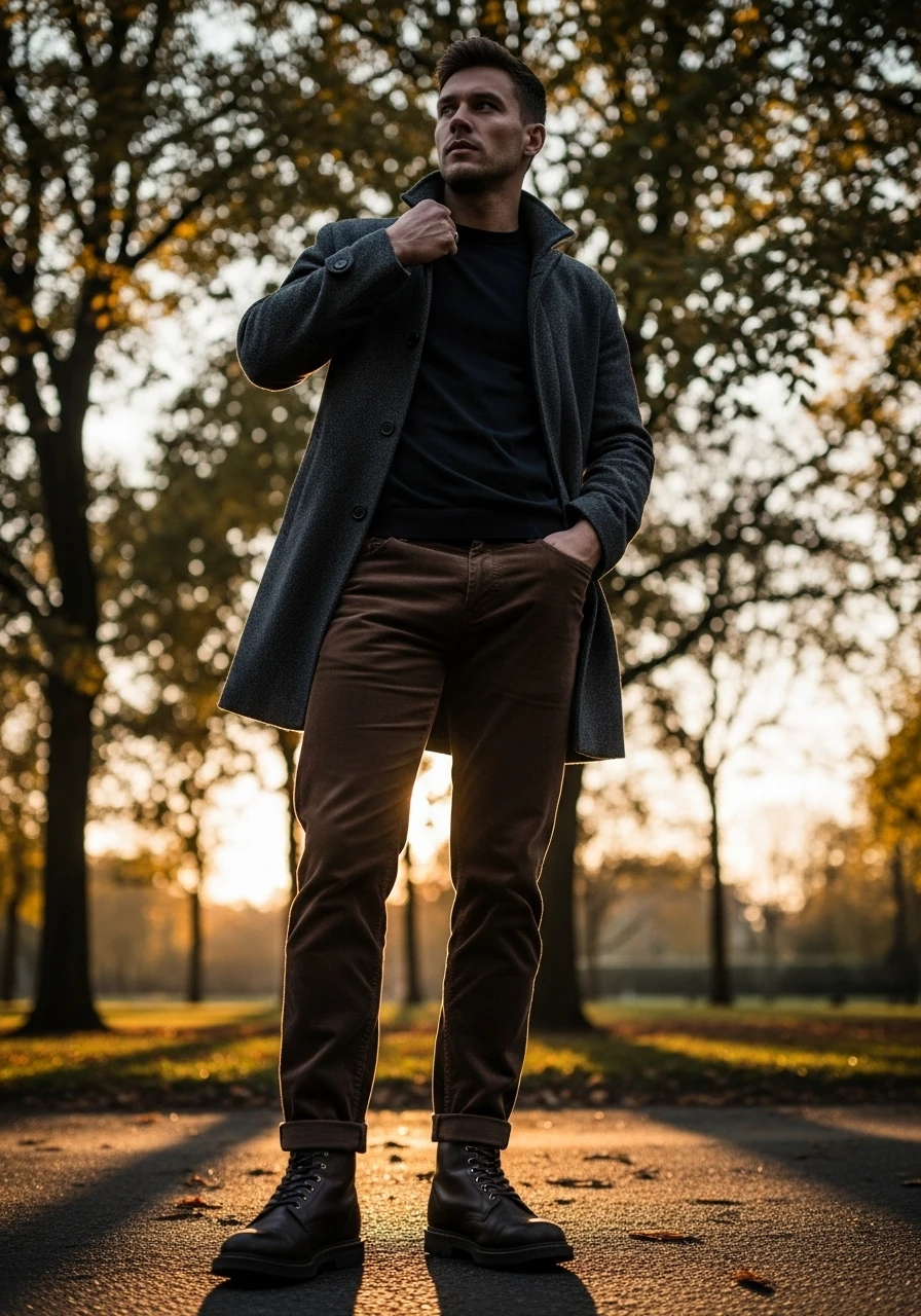 Rugged yet refined, these leather boots are made for the shift into colder days. Crafted from dark brown full-grain leather, the surface carries a natural character that deepens with wear, telling its own story over time. The sturdy sole and reinforced stitching provide durability, while the clean, minimal design makes them versatile enough for both city streets and autumn trails. Paired with corduroy trousers or a long coat, they anchor the look with quiet strength — a foundation piece for the season ahead.